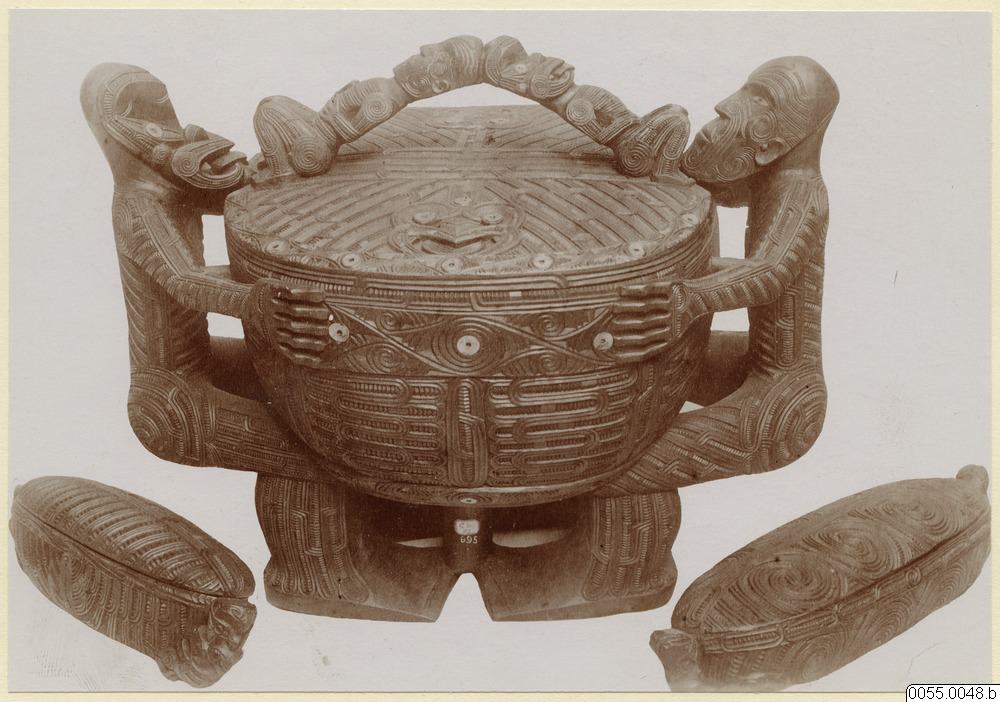 Maoriska träskulpturer, 1 skål och 2 askar att förvara fjädrar.