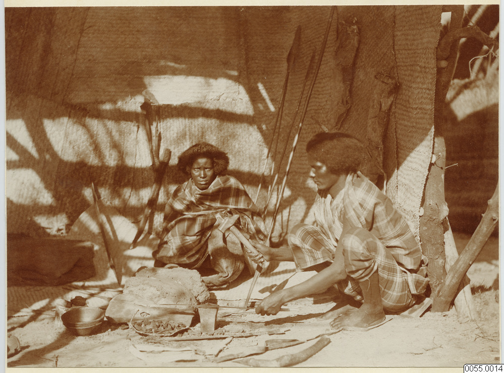 Habr-Aual; vapensmed. Ant.: Habr Awal, Tomal Stamm. Waffenschmied; der Mann in der Mitte den Blasebalg handhabend.