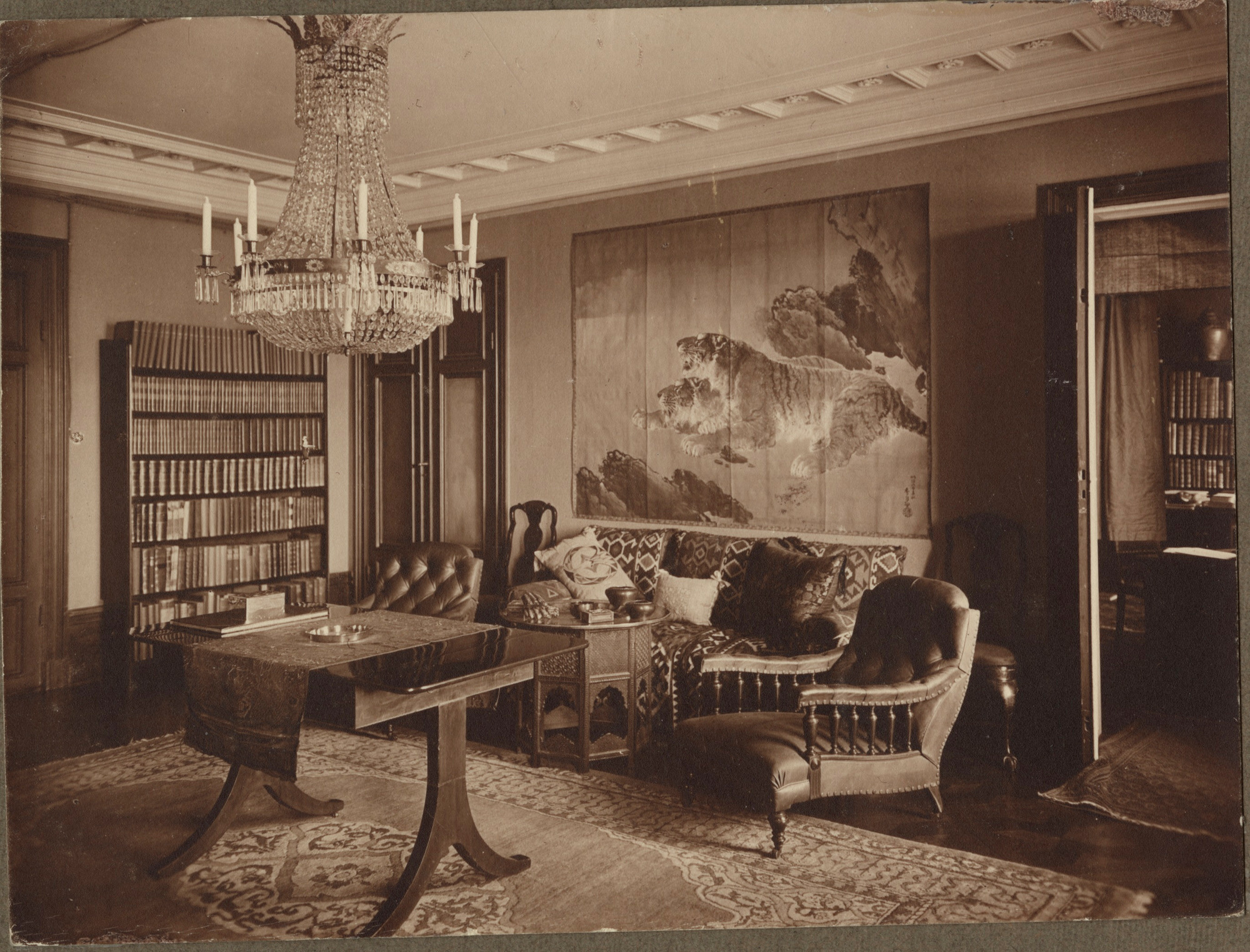 Rum hemma hos Sven Hedin, Blasieholmshamnen 5B, Blasieholmen. Här bodde familjen 1880-1931, därefter på Norr Mälarstrand 66 1931-1952. I taket kristallkrona, en bokhylla.