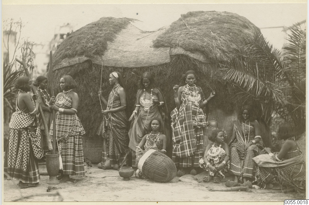 Habr-Aual och Isa; kvinnor. Ant.: Frauen u. Mädchen vor einer Habr Awal Hutte. 2 Mädchen Hirse stampfend. Die Frau mit der Kopfbinde ist die Häuptlingsfrau.