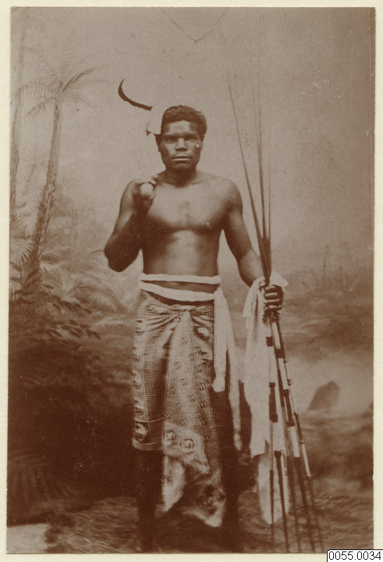 Man, beväpnad med klubba och spjut.
