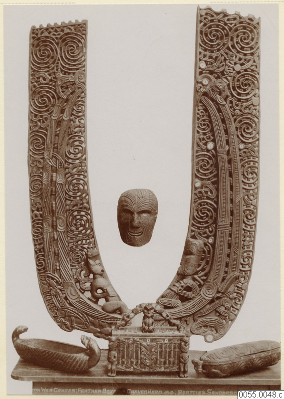 Maoriska träskulpturer, 1 mask, 2 askar och 1 fat.