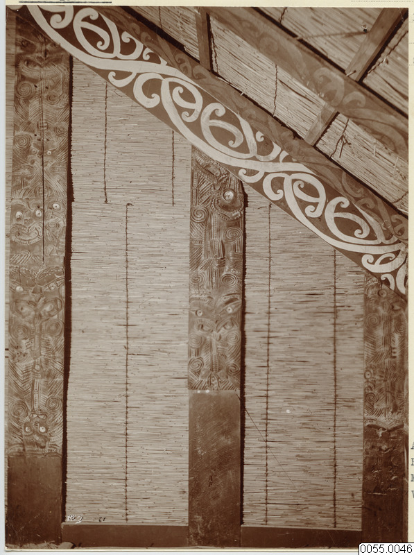 Interiör från ett maoriskt församlingshus; bakre väggen. Se nr 28. Ant.: Huiteananui. maori Raths- u. Versammlungshaus.