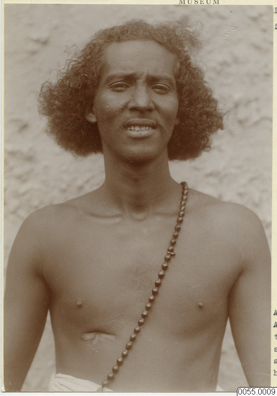 Habr-Aual; man med ärr efter ett spjutstygn. Ant.: Auf der Brust die mächtige Wunde eines Speerstiches. Der Speer wurde auf dem Rücken wieder heraus-gezogen.