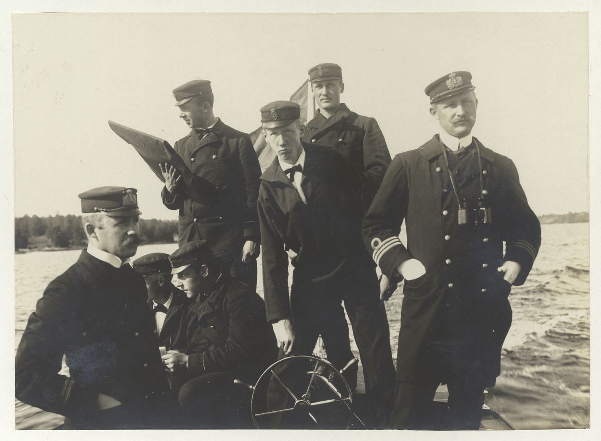 Bilden visar två befäl och fem kadetter en motorbåt i skärgården. Mannen i mitten håller styrratten och dem andra navigerar.
