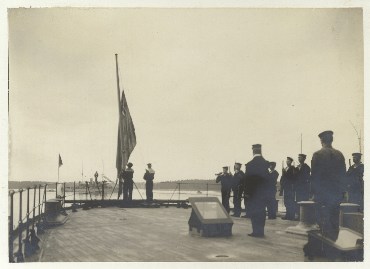 Bilden visar en grupp sjömän ombord på Dristigheten som har tagit uppställning på akterdäcket under en flaggceremoni.