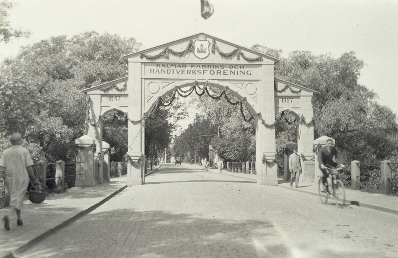 Triumfbåge byggd på Tullbron till Kalmar fabriks och hantverksförenings jubileum 1847-1927.
