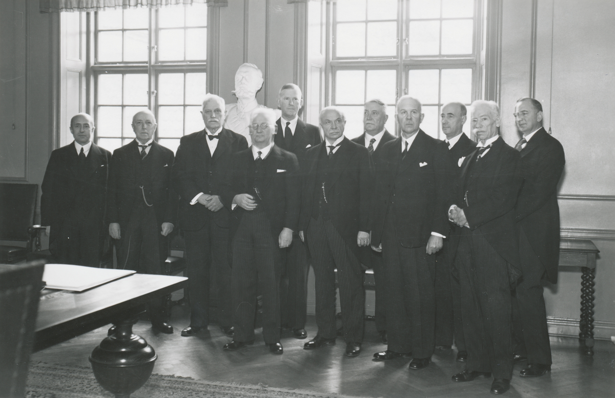 Andre man från vänster grosshandlare R L Jeansson, Kalmar. Fjärde man från vänster landshövding John Falk. Andre man från höger riksdagsman Artur Heiding, Tomtaby, Kalmar. Omkring 1930.