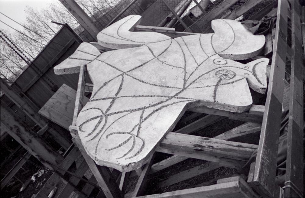 Picassoskulptur som ligger i en inhängnad på en industritomt