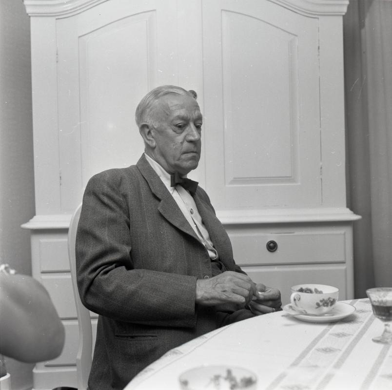 Svartvitt porträtt av Fritiof Nilsson Piraten sittandes vid ett dukat bord. På bordet, som är täckt av en mönstrad duk, syns två kaffekoppar med fat samt ett mindre glas med avec. Han lutar sig bak mot stolens ryggstöd och har båda händerna framför sig. Han tittar snett neråt på bordet. Bakom honom syns en högt, ljust skåp och längst ner till vänster i bild syns en annan persons armbåge.
