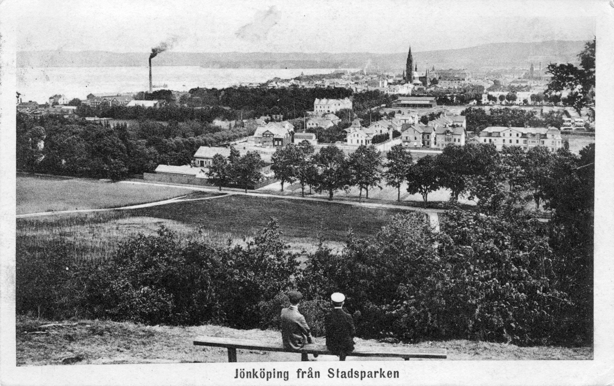 Två män sitter på en bänk och tittar på utsikten över Jönköping från Stadsparken. Vykort skickat 1922-08-29.