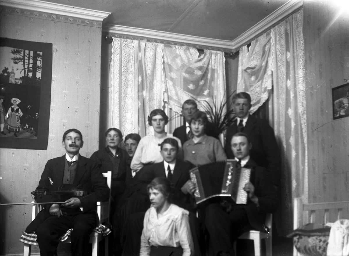 Några kvinnor och män är samlade för fotografering tillsammans med sina musikinstrument.