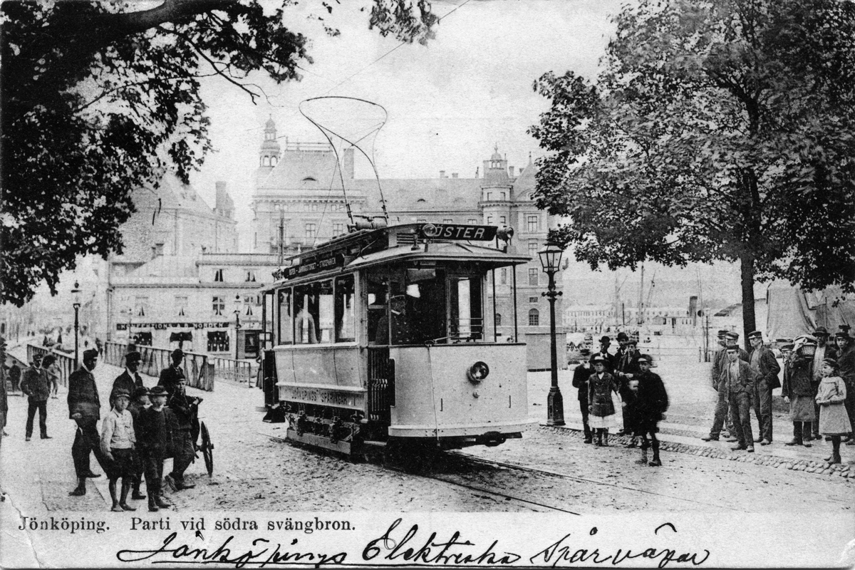 Jönköping. Parti vid södra svängbron. En elektrisk spårvagn är på väg mot Öster. I huset på andra sidan bron ligger Konfektions AB Norden. Vykort skrivet 1907-07-15.