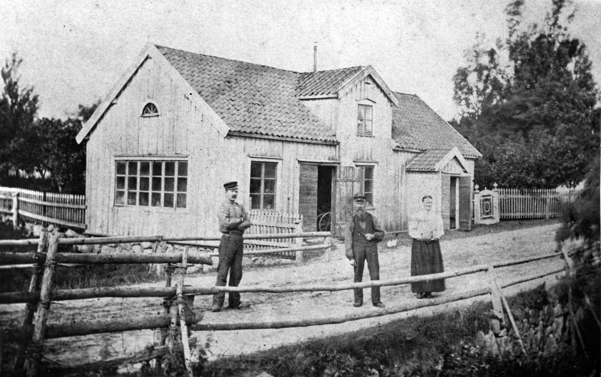 Bilden föreställer smedjan Strömslund i Tenhult. Personerna står på Åsabron, över den bäck som så småningom mynnar ut i Huskvarnaån.