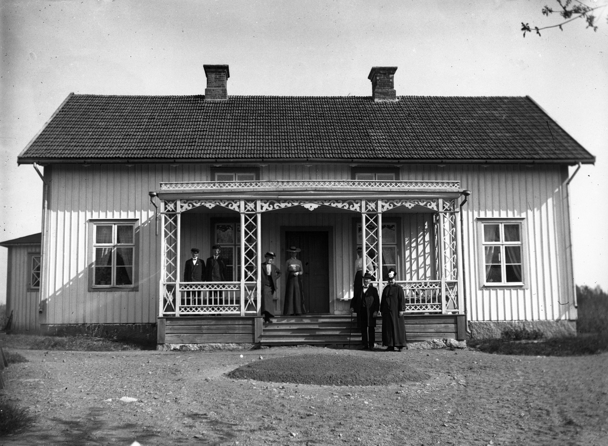 Kvinnor och män står på en stor veranda med snickarglädje.