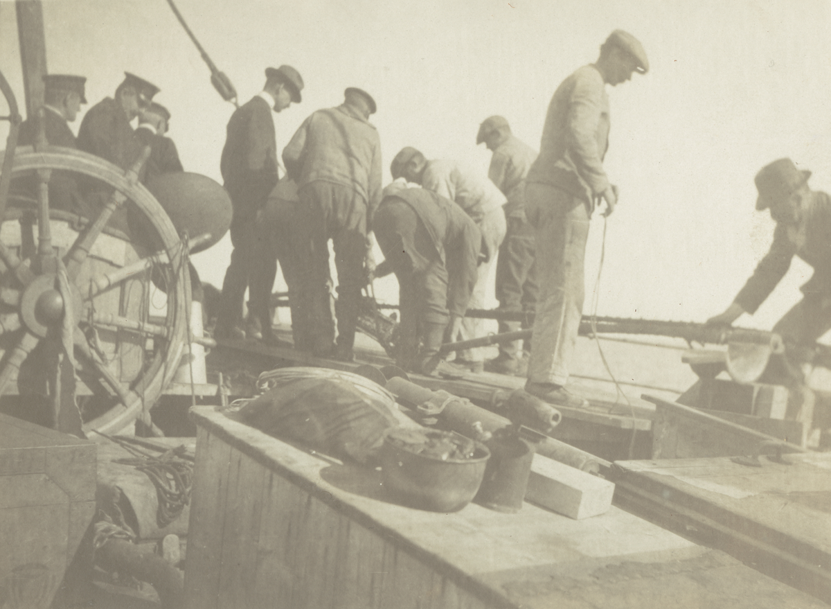 Kabeldragning Kämpinge - Zarrenzin, september 1921. Lödställe baxas ur. Ur albumet Telegrafverkets Sjökabelarbeten 1919-1921.