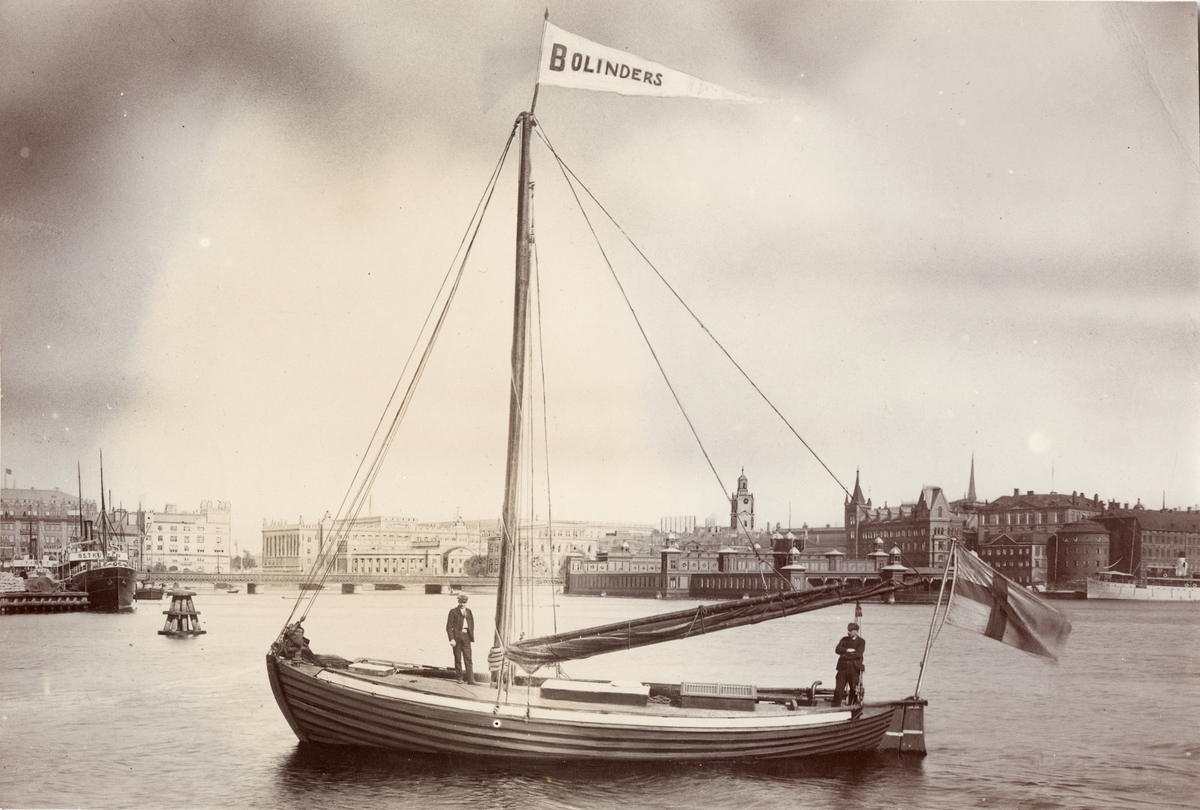 Segelbåt. Bolinder. Med vy över Stockholm från Mälarsidan. Riddarholmen till höger. Ur album: J. & C. G. Bolinder's M. V.A.B. Stockholm.