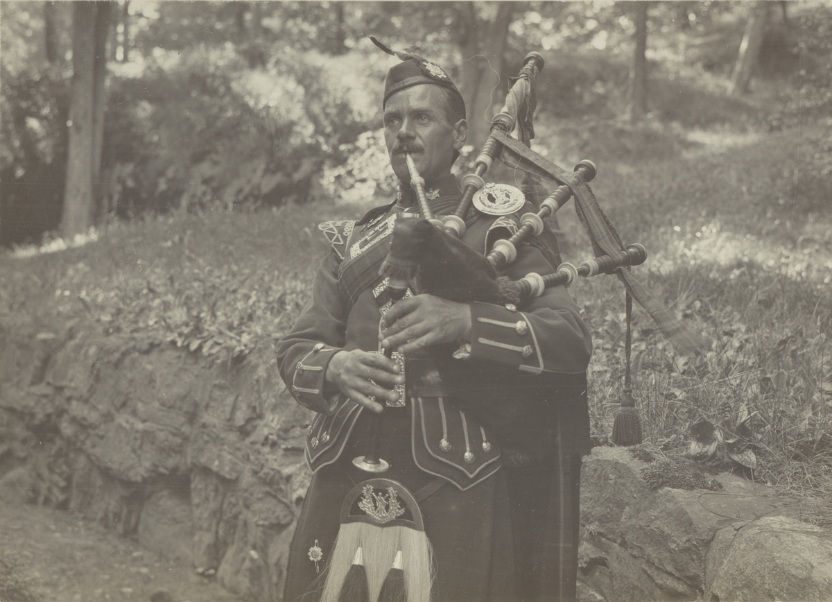 Jubileumsutställningen i Göteborg 1923. Man spelar säckpipa. Ur albumet Utställningen Göteborg 1923.