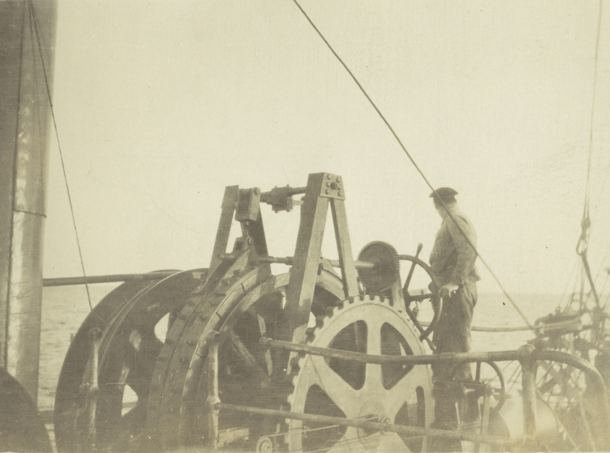 Kabeldragning Kämpinge - Zarrenzin, september 1921. H.K.D Randulf Hansen. Urläggningsmaskin. Ur albumet Telegrafverkets Sjökabelarbeten 1919-1921.