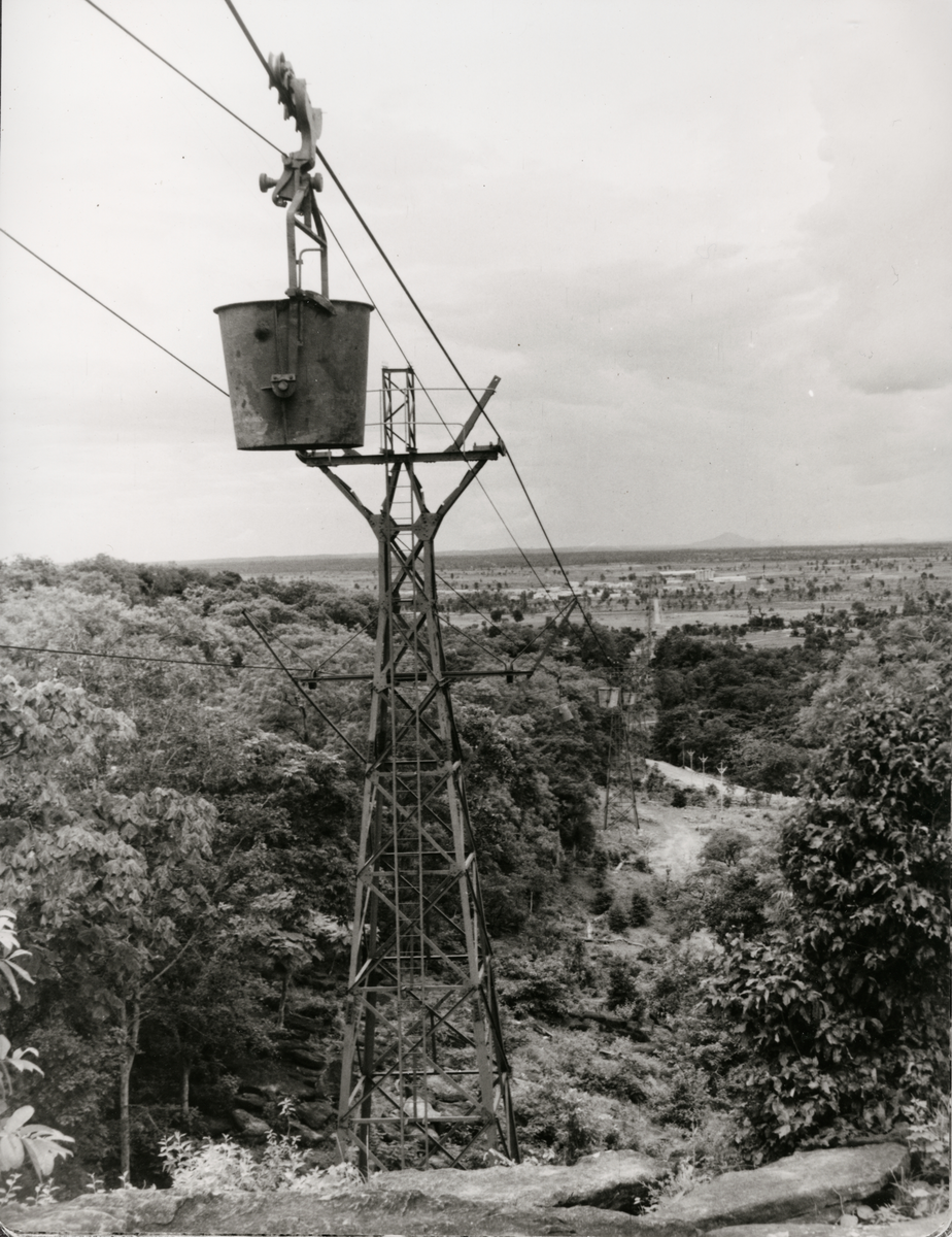 The Associated Cement Company's linbana vid Mancherial, Hydarabad, Indien. Längd: 4365 m, kapacitet: 200 ton kalksten per timme. Linbanan började användas 1958. Ur album: Nordströms: AB Nordströms Linbanor Stockholm, Sweden.