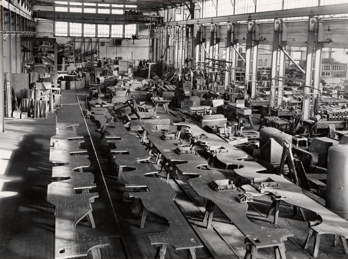 Motala Verkstad. Maskinverkstaden. Montagehall för elektriska lokens underreden. Ur album: Motala Verkstad 10 okt 1936.