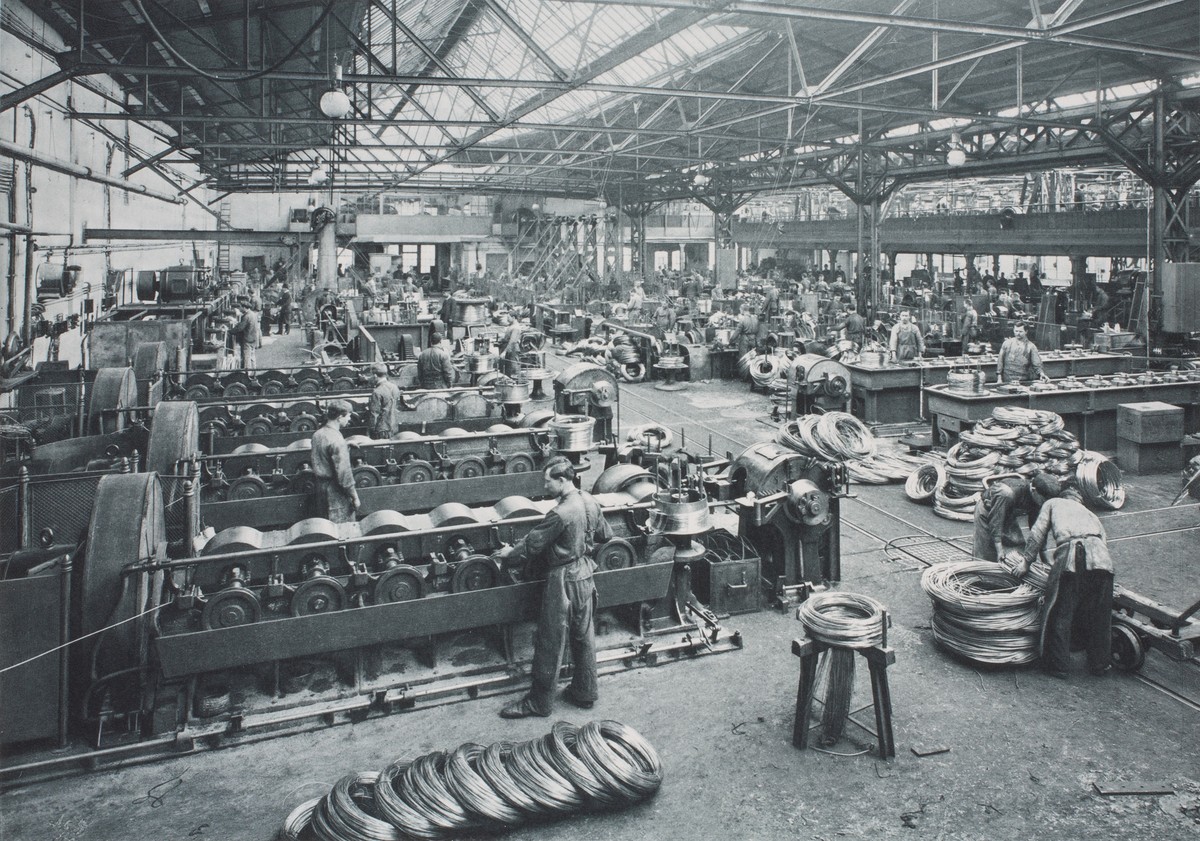Kabelverk. Koppartråddrageri. Män i arbete.