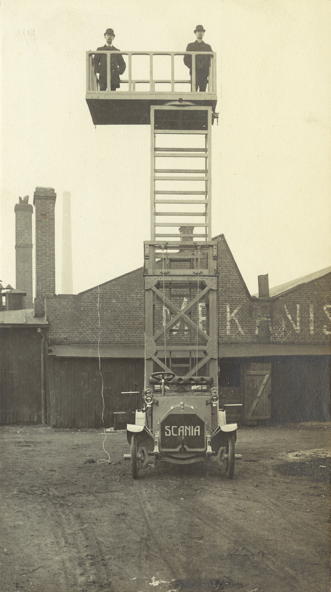 Lastautomobil med hissbar stege. Ur album Scania Lastautomobiler.