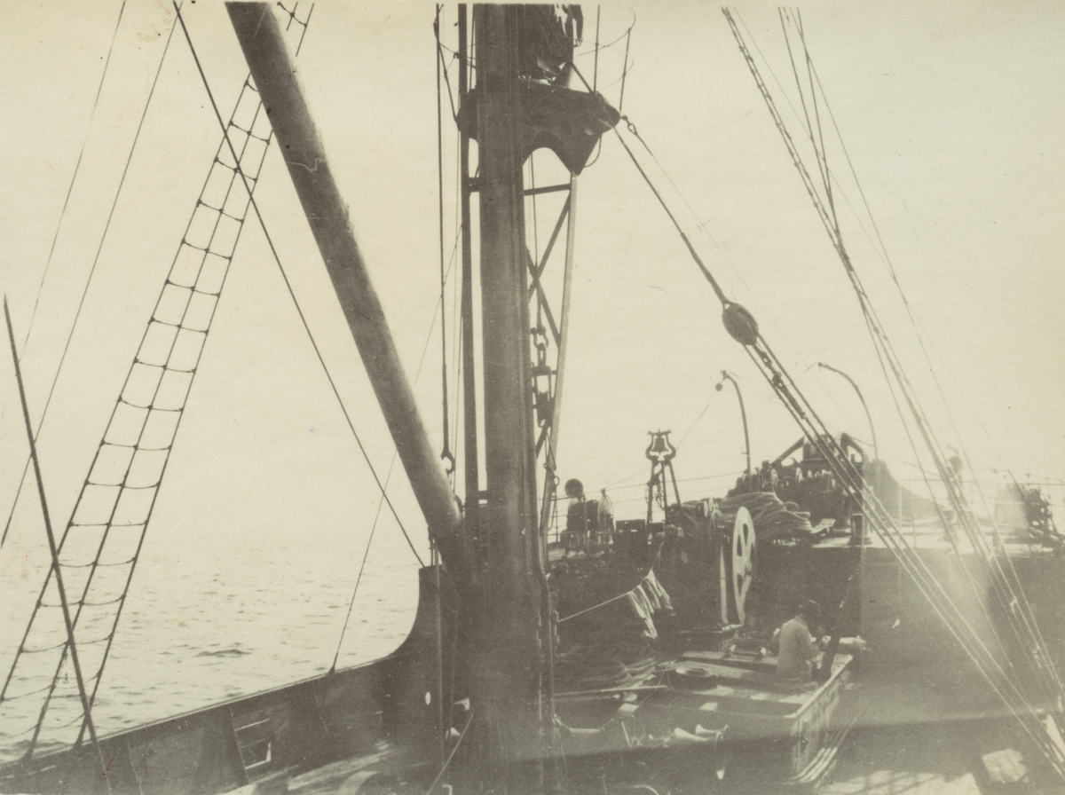 Kabeldragning Kämpinge - Zarrenzin, oktober - november 1919. Fördäck. Ur albumet Telegrafverkets Sjökabelarbeten 1919-1921.