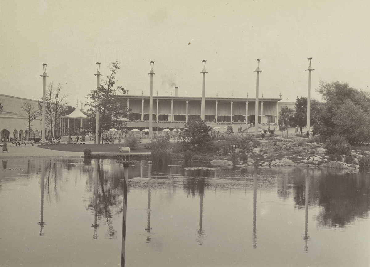 Jubileumsutställningen i Göteborg 1923. Huvudrestaurangen. Vy från Näckrosdammen. Ur albumet Utställningen Göteborg 1923.