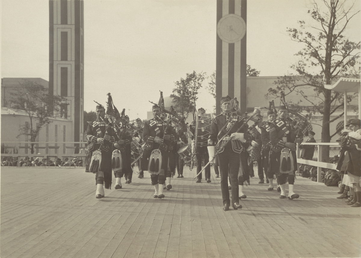 Jubileumsutställningen i Göteborg 1923. Parad med säckpipor och trummor vid minareterna Lejonet och Kronan. Ur albumet Utställningen Göteborg 1923.