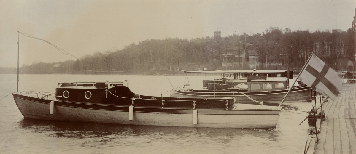 Motorbåt. Bolinder. Vid Kungliga Motorbåtsklubben, Djurgårdsbron, Stockholm. Ur album: J. & C. G. Bolinder's M. V.A.B. Stockholm.