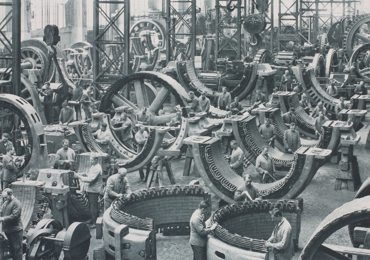 Kvinnor och män i arbete. Grossmaschinenfabrik. Spulenwickelei.