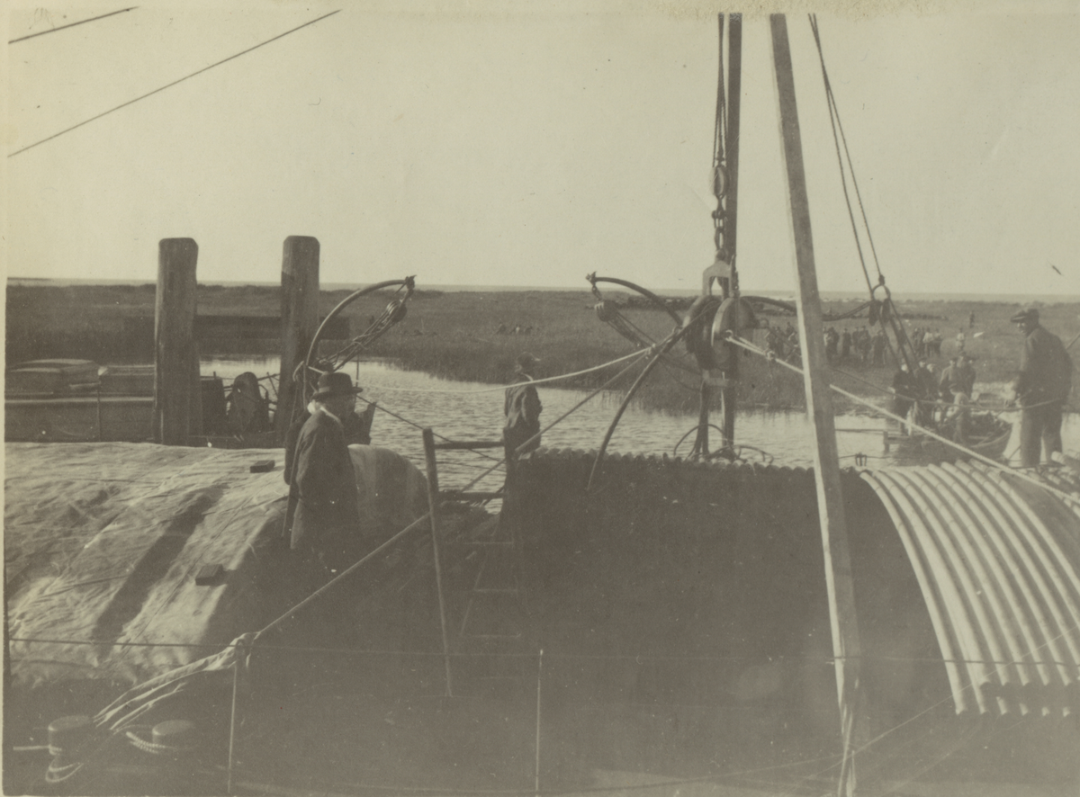 Kabeldragning Kämpinge - Zarrenzin, oktober - november 1919. Ilandföring av Bock. Ur albumet Telegrafverkets Sjökabelarbeten 1919-1921.