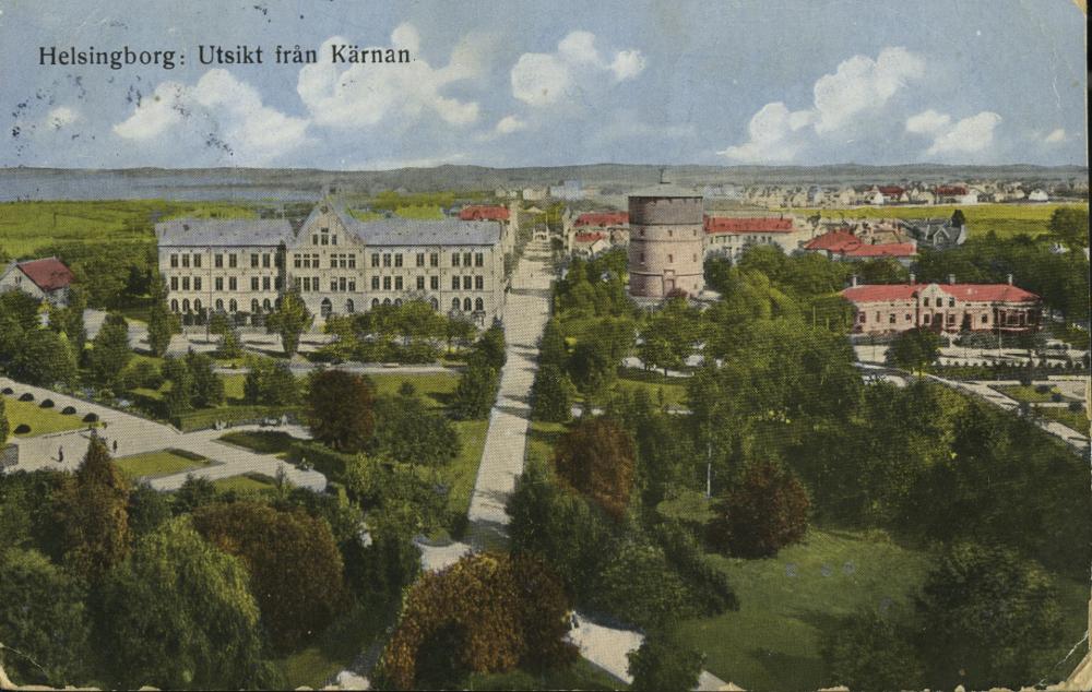 Bilden föreställer en vy över Helsingborg mot öster med Slottshagen, Slottsvångsskolan och gamla vattentornet.
