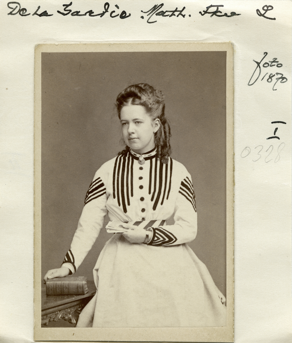 Fröken Matilda De la Gardie med omisskännliga drag av fadern, landshövding Robert De la Gardie. Porträttet är daterat 1870 och visar henne i tidstypisk håruppsättning för en ung kvinna och en dräkt i tidens mode. Som äldsta dotter till landshövdingen och likaledes adliga modern Matilda von Kraemer torde hon nu i 18-årsåldern börjat visa sig på den yppersta äktenskapsmarknaden. Där skulle hon dock inte låta sig väljas, utan förblev ogift livet igenom. Till Linköping hade familjen kommit år 1867 i samband med utnämningen och staden blev deras hem till 1901 då flytten gick till Stockholm.