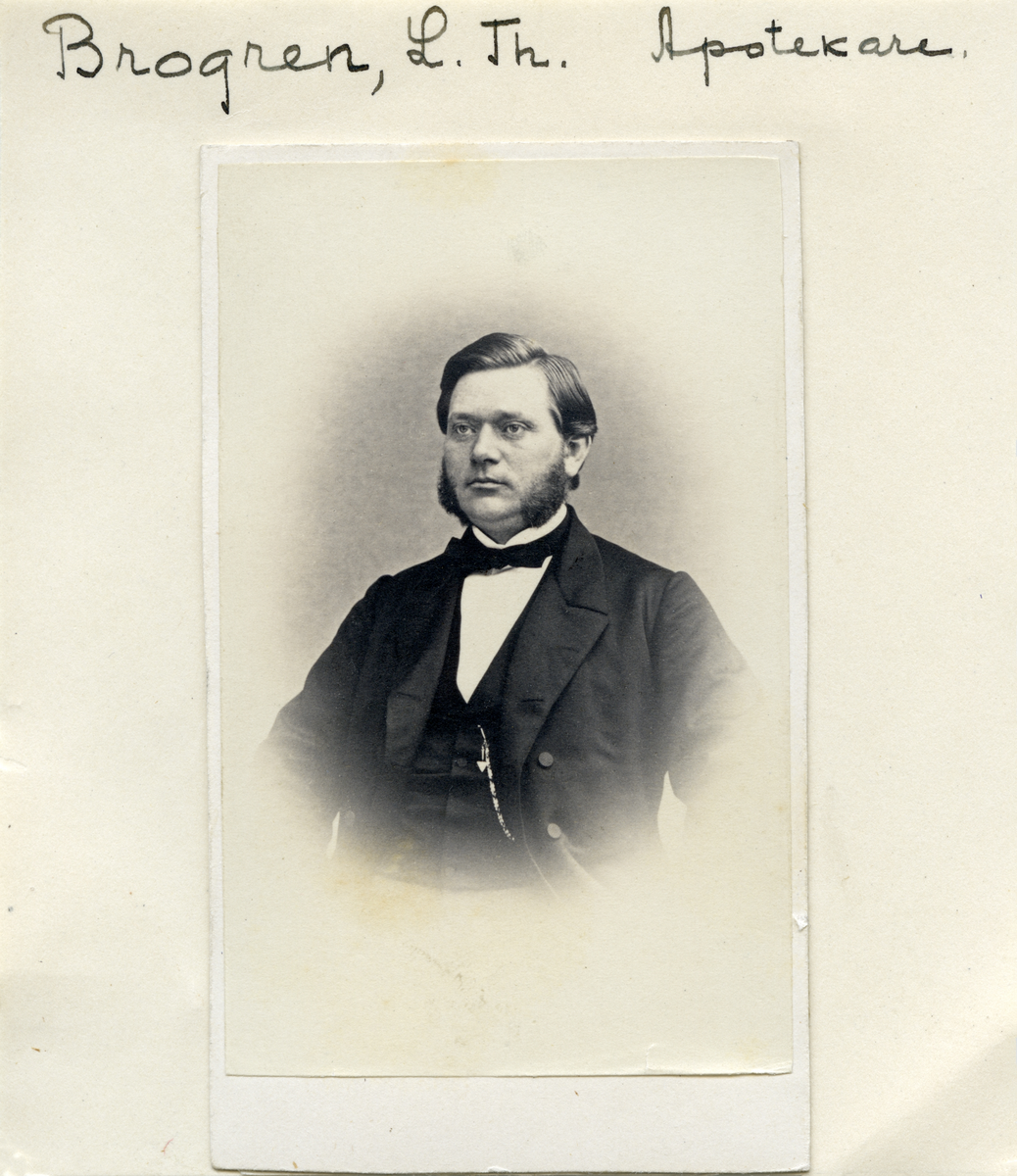 Ludvig Theodor Brogrens betydelse för Linköping var betydande. Född i Gammalkil 1827 kom han under ungdomsåren att bedriva studier i Stockholm. Efter apotekarexamen 1852 styrde han åter till Östergötland där han erhållit privilegium att förestå apoteket i Kisa. Kort före inflyttningen hade han gift sig i med Theresia Brogren. Från 1858 var han verksam i Linköping som innehavare av apoteket Vasen. Parallellt med apotekargärningen anlade han tidigt det bryggeri, L. Th. Brogrens bryggeri, som genom efterföljare kom att bestå på bryggeritomten invid Stångån ända till 1971. Här porträtterad vid 1860-talets första hälft.