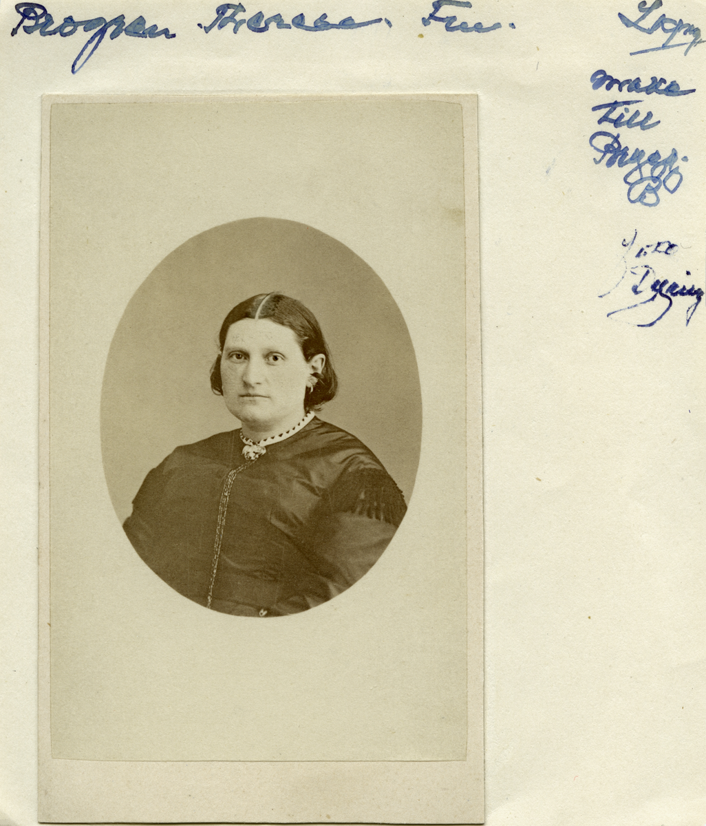 Porträtt av Theresia Brogren, Linköping. Maka till apotekaren och bryggaren Ludvig Theodor Brogren. Här porträtterad vid 1860-talets första hälft.