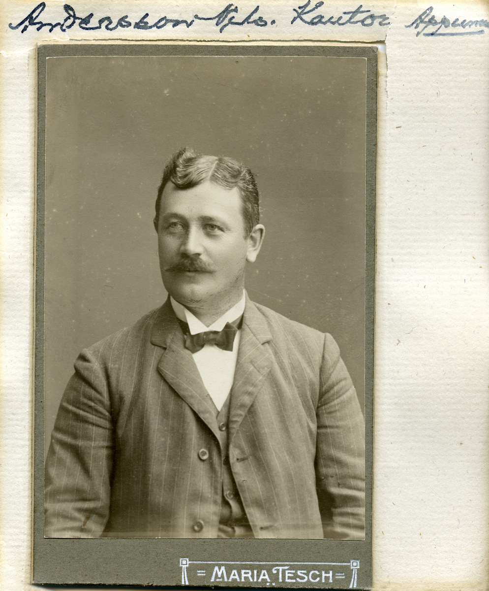 Den från Kisa bördige Nils Andersson kom efter seminariestudier att tillsättas tjänsten som folkskolelärare och kantor i Appuna. Han inflyttade till sin nya hemort sommaren 1899 och erbjöds bostad i Appuna skolhus. Hans tid i Appuna lämnar i källorna inte någon större förändring i hans liv förrän giftemålet med Augusta Helena Holts 1923. Kort före bröllopet hade parets son nedkommit. Lyckan blev dock kort. Nils Andersson avled i sviterna av diabetes 1925. Foto omkring 1910.