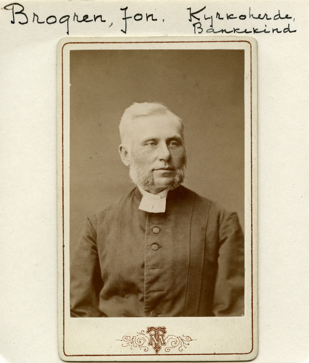 Porträtt av Jon Brogren. Kyrkoherde i Vånga och från år 1888 i Bankekind. Här porträtterad i Maria Teschs ateljé omkring år 1880.