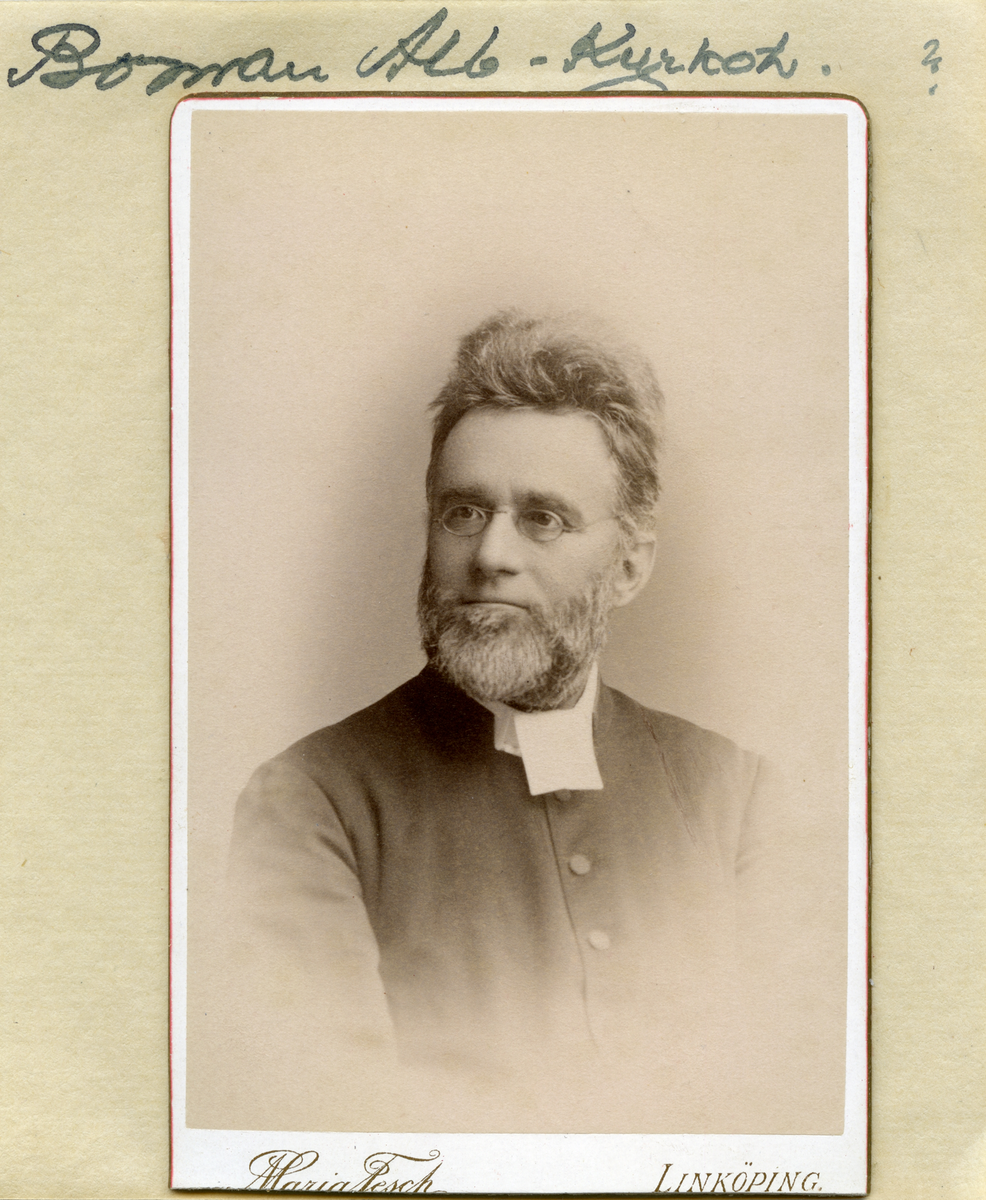 Porträtt som tolkats framställa kyrkoherde Albin Boman, född i Åtvid 1844. Kyrkoherde i Locknevi från 1876 och i Gärdserum från 1882. Död därstädes 1914. Här porträtterad i Linköping omkring 1890.