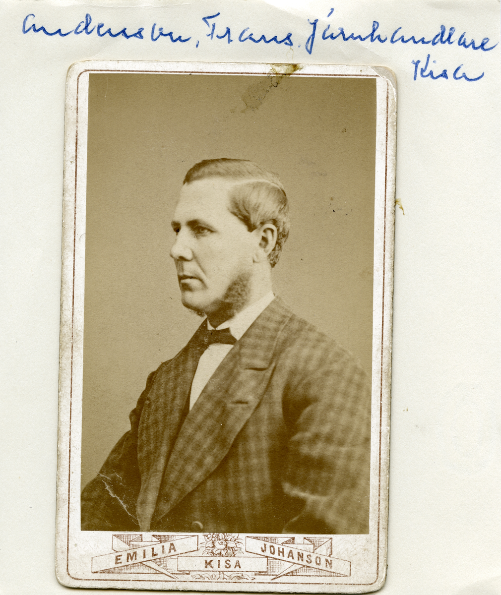 Gästgivaregården i Kisa får sägas varit platsen för den avbildade Frans Andersson. Där växte han upp och kom att vidare kvarbo livet ut. Sannolikt tog han tidigt aktiv del gästgiveriets verksamhet men från mitten av 1880-talet titulerade han sig som handlare, sedermera mer preciserat som järnhandlare. Här omkring 1875.