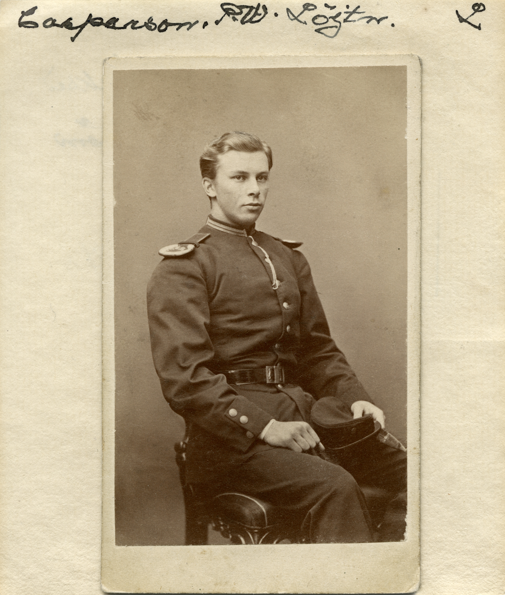 Porträtt av Per Wilhelm Casparsson. Uppvuxen på sin mors Ulrika Maria Scharps gods Harvestad i Landeryd och efter hennes omgifte styvson till överste Hampus Mörner. Kadett år 1870 och vidare underlöjtnant vid Första livgrenadjärregementet i Linköping. Sedermera löjtnant men tvingades avträda sin militära karriär på grund av sjukdom. Från 1885 gift med Anna Helena Karolina Frick. Paret bodde på Saxtorp i Ljung socken men lämnade länet 1889 för nytt boende i Gränna. Foto omkring 1870.