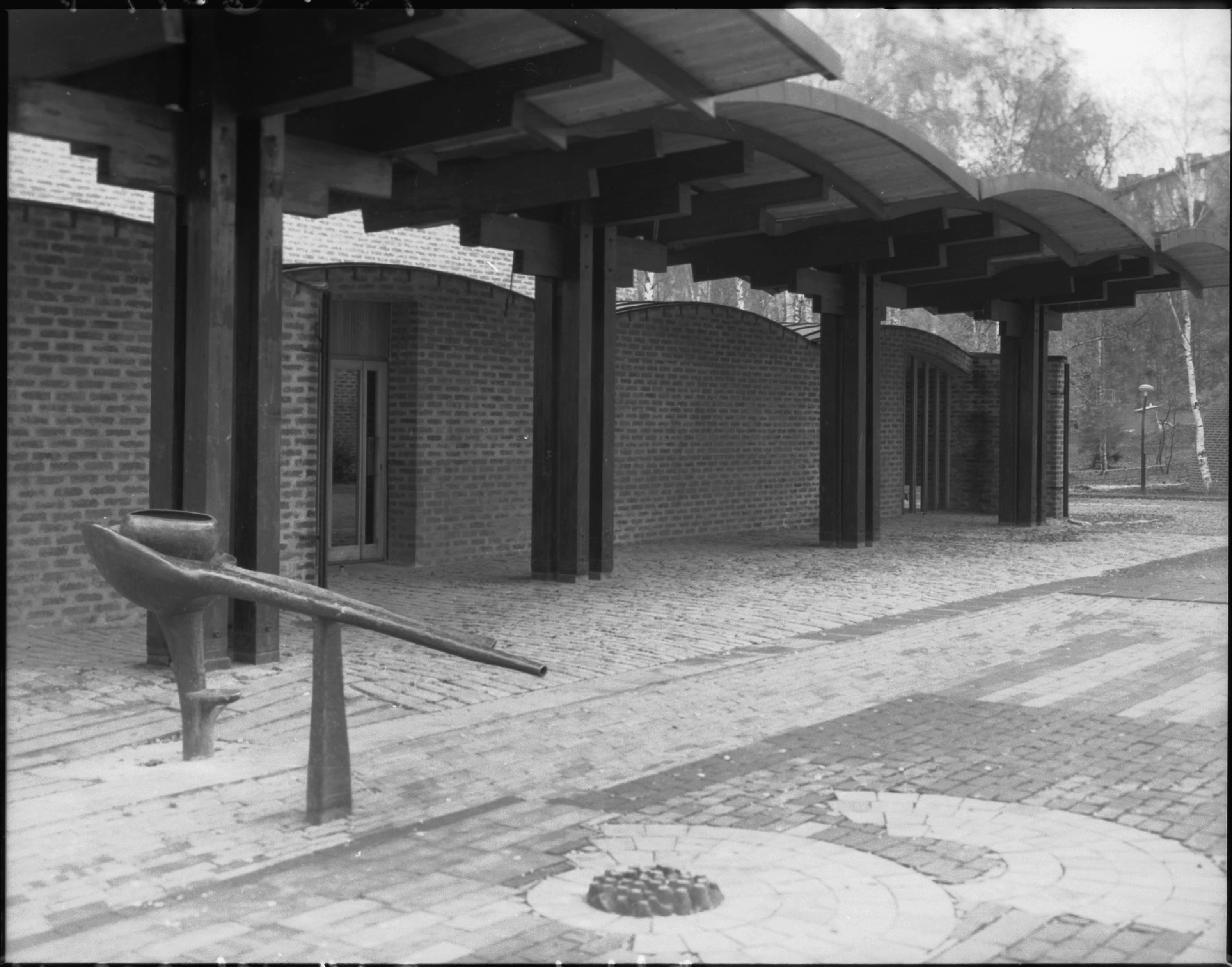 Kyrkan mot nordväst, i förgrunden skulptur vid Spegeldammen.