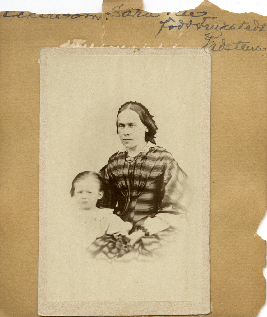 Född i ett prästhem i värmländska Nyed växte Sara Frykstedt upp i Sunne prästgård, där fadern fått tjänst 1821. Tidigt föräldralös följde en tid för henne som mamsell och vidare guvernant i ett flertal välbärgade hem i landskapet. Vid någon av sina tjänster mötte hon sin blivande make Carl Anders Eckerbom och de lät viga sig i tid före deras förstfödde 1844. Familjen var då bosatt i Nedre Ullerud där maken var bruksfogde. Tiotalet år därpå lämnade makarna Värmland för ny tillvaro i Vadstena. I den nya hemstaden titulerades maken som kommissionshandlare och i parets hem sköttes parets nu sex barn. Makarnas sjunde barn föddes i Vadstena och det är rimligtvis hon vi ser invid modern. Av samma grund kan porträttet dateras till 1860-talets första år.