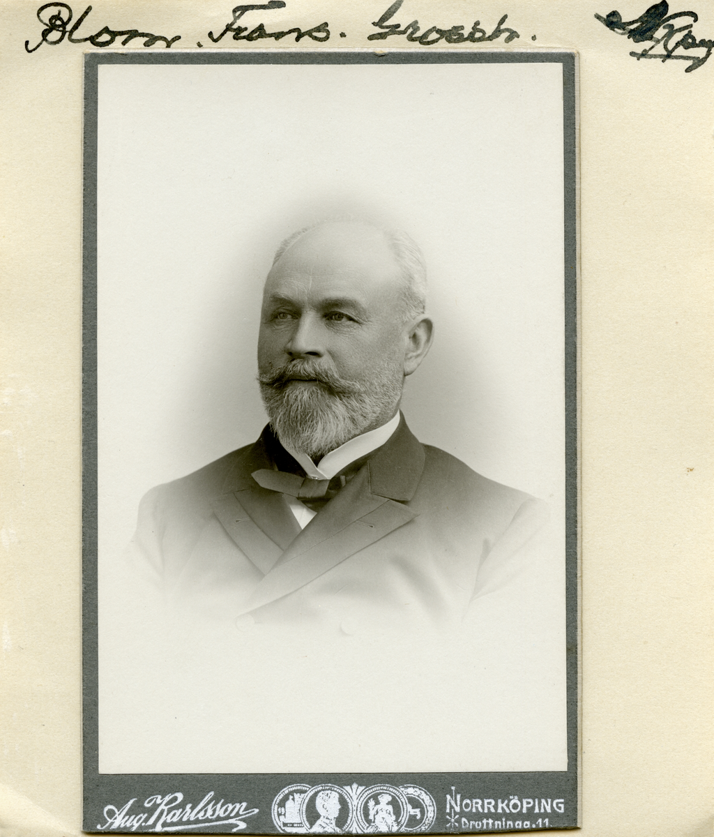 Porträtt av grosshandlare Frans Blom, vilken torde överensstämma med den framgångsrika affärsmannen som för dagens Norrköpingsbor inte minst är ihågkommen för det så kallade Blomska hemmet. Det pampiga stenhuset utmed Norra Promenaden stod klart 1919 och var finansierat genom Frans och Matilda Bloms stiftelse. Husets 26 lägenheter var ämnade för behövande kvinnor som erbjöds gratis bostad livet ut. Den pampiga invigningen genomfördes under ledning av landshövding Eric Trolle. Foto omkring 1900.