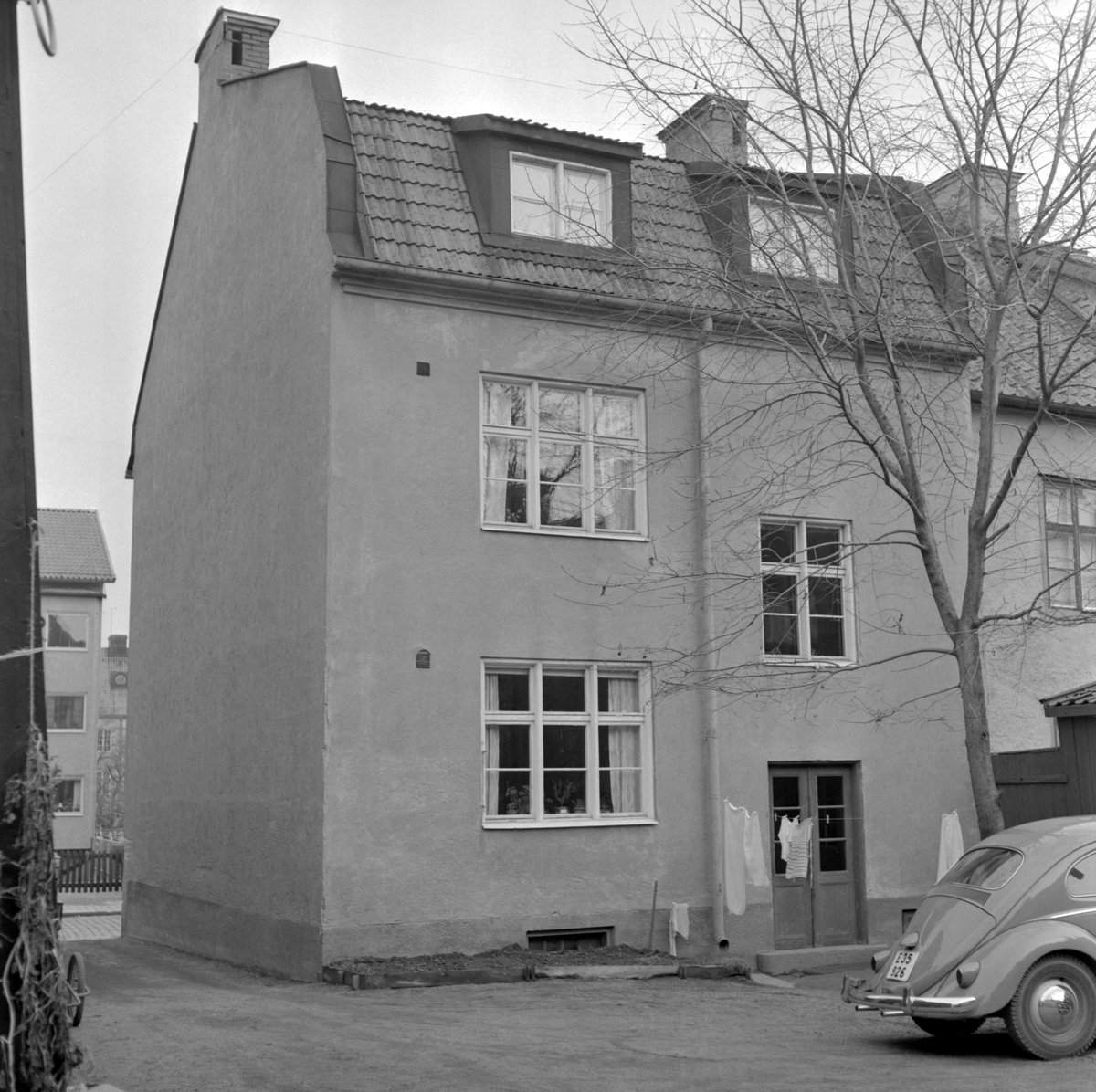 Gårdsinteriör från Hunnebergsgatan 16 i Linköping. Fotoåret 1961 stod tomtens andra, kända generation hus på platsen, en påbyggnad mot västra gaveln till Hunnebergsgatan 14. Den tillbyggda huskroppen hade ersatt ett av de många ålderdomliga trähus som fordom kantat gatan. Under senare delen av 1970-talet kom turen till bildens hus att lämna plats för en ny huslänga.