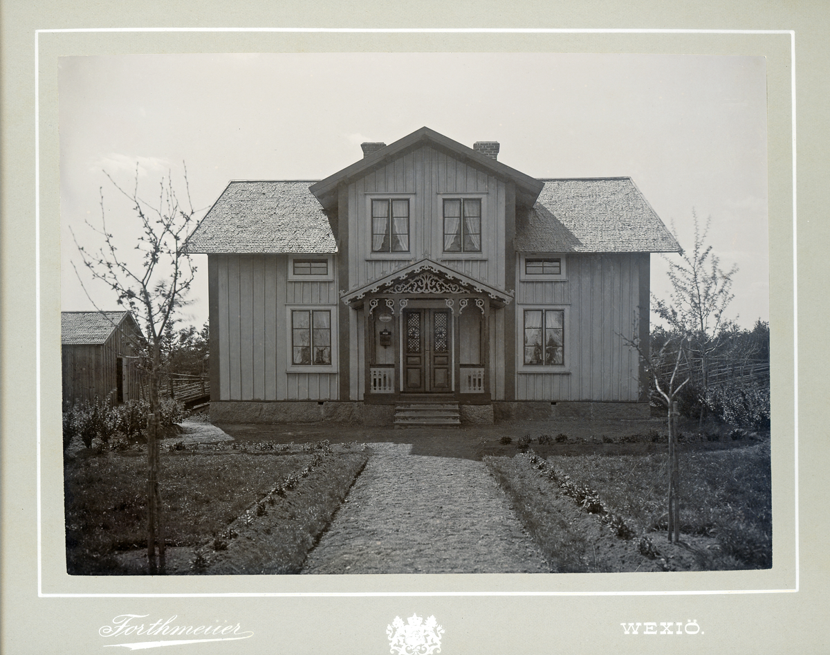 Ett bostadshus med veranda i en trädgård. Till vänster syns ett uthus.