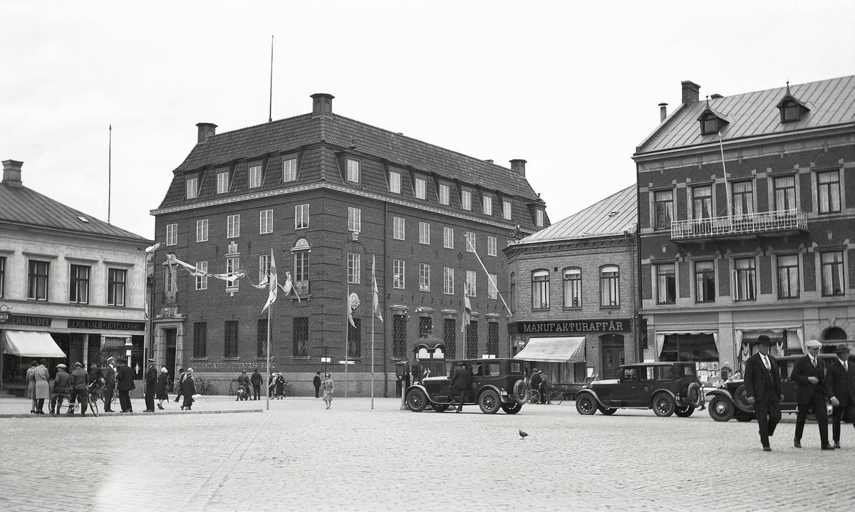 Vid sidorna syns flera butiker, bl a Kalbs guldsmedsaffär.