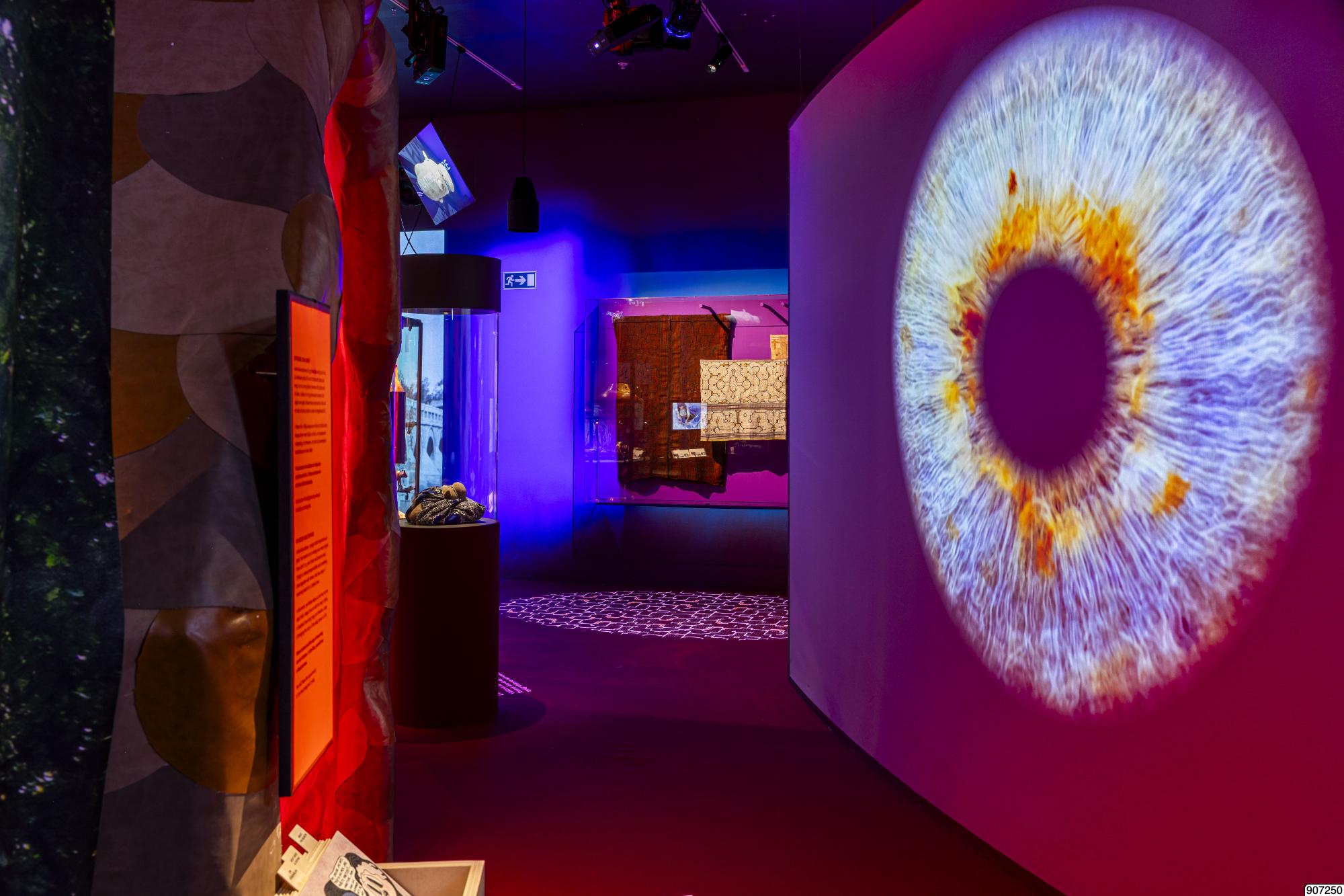 Beskrivning: Interiörbilder från utställningen Existens på Världskulturmuseet, hösten 2025