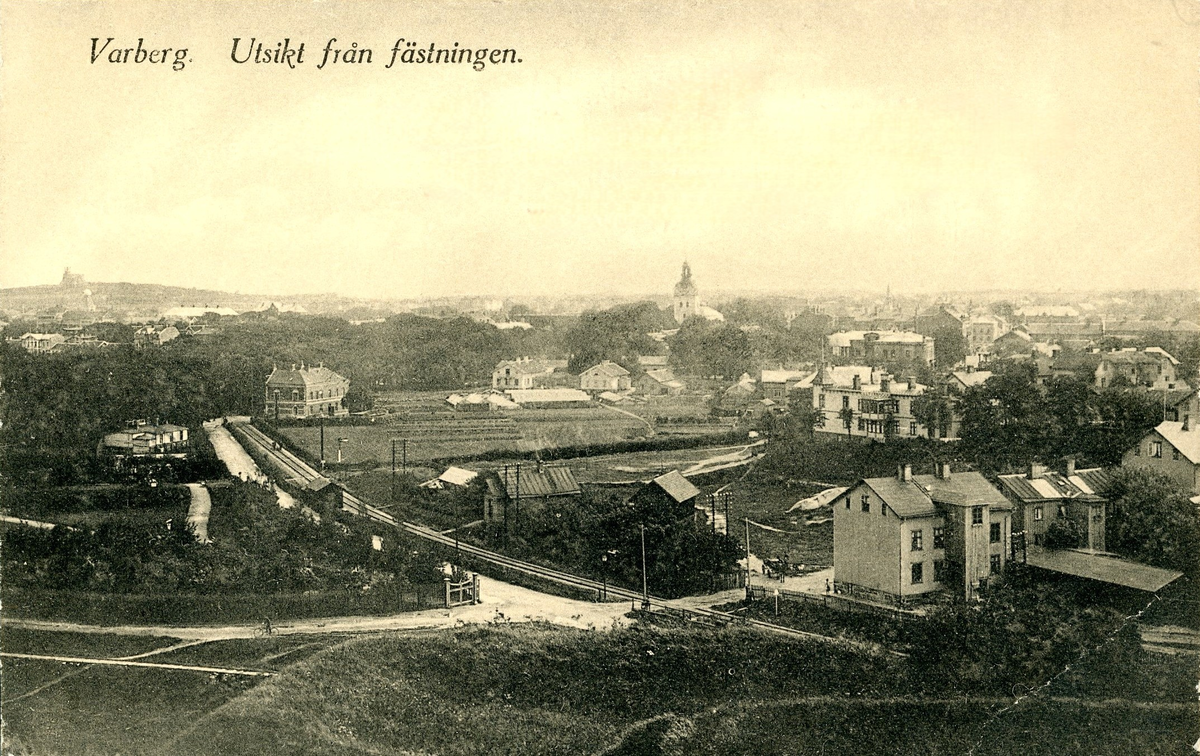 Vykort, "Varberg. Utsikt från fästningen." I centrum ses trädgårdsmästare Jeppa Persson Förstbergs plantskola i Damlyckan med bostadshuset till vänster, alldeles intill Mellersta Hallands järnväg som invigdes 1886. Villan uppfördes 1896 på Södra Hamnvägen 12 i nuvarande kv Skepparen. På andra sidan järnvägen och Strandvägen ligger Edvard Mathssons fotoateljé, senare s k Lottastugan, Badhusparken (Societets-). Längre ned längs järnvägen ligger "Freds" banvaktarstuga och till höger i bild ses delar av Platsarna. Huset där Slottsgatan idag går upp står ännu kvar. På berget i fjärran skådas vattentornet. Järnvägen söderut fick ändrad sträckning år 1920.